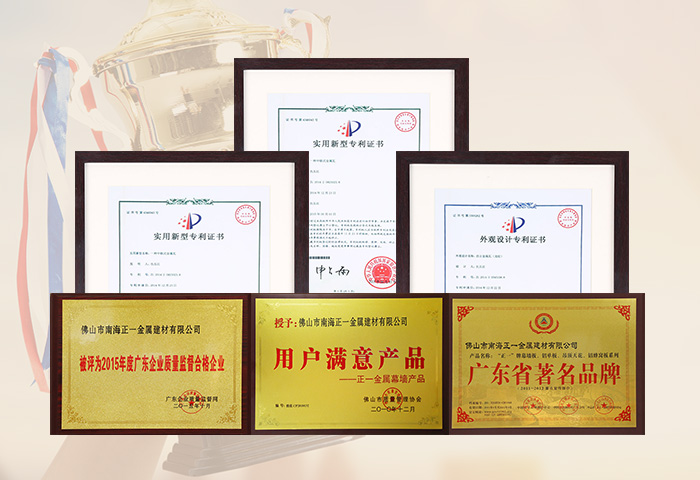 通過ISO9001認證,國家建筑材料測試中心和中國有色金屬華南產品質量監(jiān)督檢驗中心合格檢測,符合美國建筑制造商協會AAMA2605-98涂層標準,被國家建設部認定為建筑鋁合金外墻板、鋁合金天花板定點生產企業。
